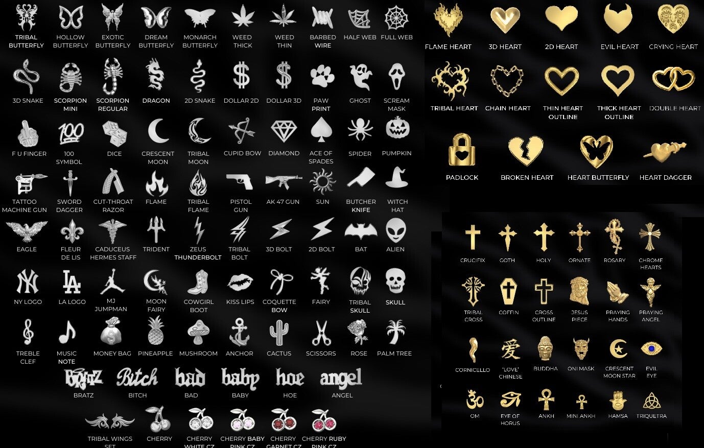 Discover the perfect tooth gem to match your individual style from this exquisite collection. We specialise in high-quality Swarovski crystal gems that catch every light, available in a variety of captivating colours. For a touch of luxury, explore the white or yellow gold caps. Beyond classic crystals and caps, we offer a range of unique symbols such as stars, elegant hollow hearts, and religious crosses. Have something specific in mind? Many other designs are available upon request, ensuring your smile truly reflects you.